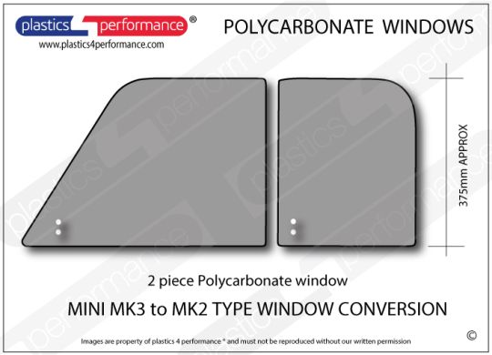 2 piece sliding door window for the MK3 mini, fits our old conversion kits which used all standard MK1/2 rails and seals (available from minispares).